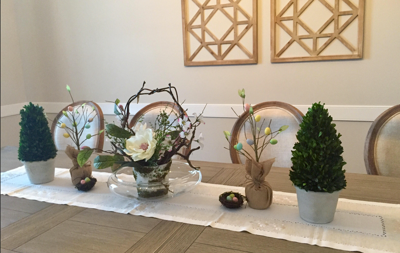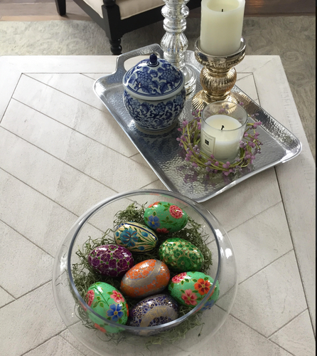 I currently have my Easter decor out for spring. I enjoy decorating with items I’ve collected over the past few years that hold sentimental meaning to me. My favorite being decoupage eggs from Greece that I’m displaying in my living room. I also like finding arrangements made of life like artificial flowers so I can reuse them from year to year.